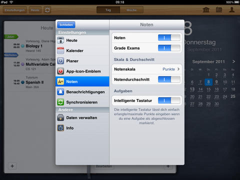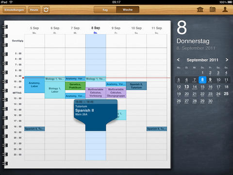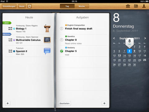 Auf den ersten Blick sieht iStudiez Pro aus, wie jeder andere Kalender. Die Darstellung auf iPad und iPhone unterscheidet sich stark, doch auf beiden Geräten wird das Optimum herausgeholt. Die Monatsansicht, die auf dem iPad immer zu sehen ist, weist bereits auf die anstehenden Termine hin. Unterstützt werden einmalige, wöchentliche, rotierende und Block-Veranstanlungen. Ein Tipp auf das entsprechende Datum öffnet die detaillierte Tagesansicht. Die zeigt die noch anstehenden Termine an, zurückliegende gibt es nur in der Wochenansicht zu sehen. Jedem Kurs fügt ihr, egal in welcher Ansicht, per Fingertipp eine Aufgabenliste inklusive Fälligkeitstermin hinzu. In einem eigenen Abschnitt nennt die App die Aufgaben und erinnert auch rechtzeitig vor deren Ablauf. Schafft ihr es nicht rechtzeitig, greift auf die eigene Kontaktliste zu und erfahrt hier die Sprechzeiten des Dozenten.