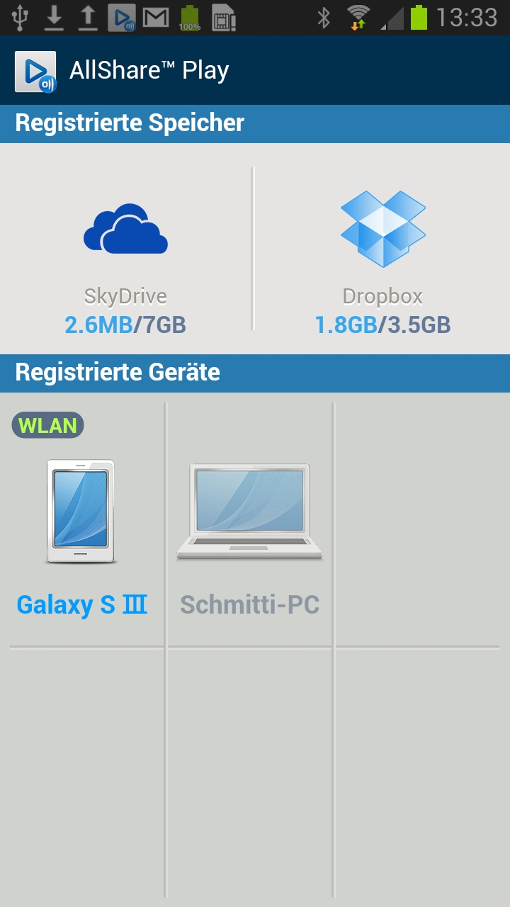 Die Einrichtung des smarten Datenaustausch-Tools ist auf eurem Samsung-Handy oder -Tablet denkbar einfach – ihr meldet euch mit den Zugangsdaten eures Samsung-Kontos an, woraufhin das entsprechende Gerät automatisch in die Liste der registrierten Geräte aufgenommen wird – schon stehen alle geteilten Inhalte im Netzwerk zur Verfügung. „Per Speicher registrieren“ aus dem Menü fügt ihr Online-Speicher hinzu – AllShare Play bringt selbst keinen Cloud-Speicher mit, sodass ihr auf externe Dienste wie Dropbox oder SkyDrive angewiesen sind.