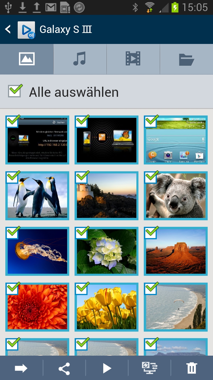 Das Auswahlmenü von AllShare Play ist in vier Bereiche unterteilt – Bilder, Musik, Videos und Daten. Wenn ihr nun eine (Medien-)Datei auswählt, erscheinen am Display-Rand unten fünf Funktionstasten, mit denen ihr eine oder mehrere ausgewählte Dateien in den Online-Speicher befördert, über Datendienste oder soziale Netzwerke teilet, streamt oder wiedergebt, an ein anderes Gerät übertragt und in den virtuellen Papierkorb befördert.