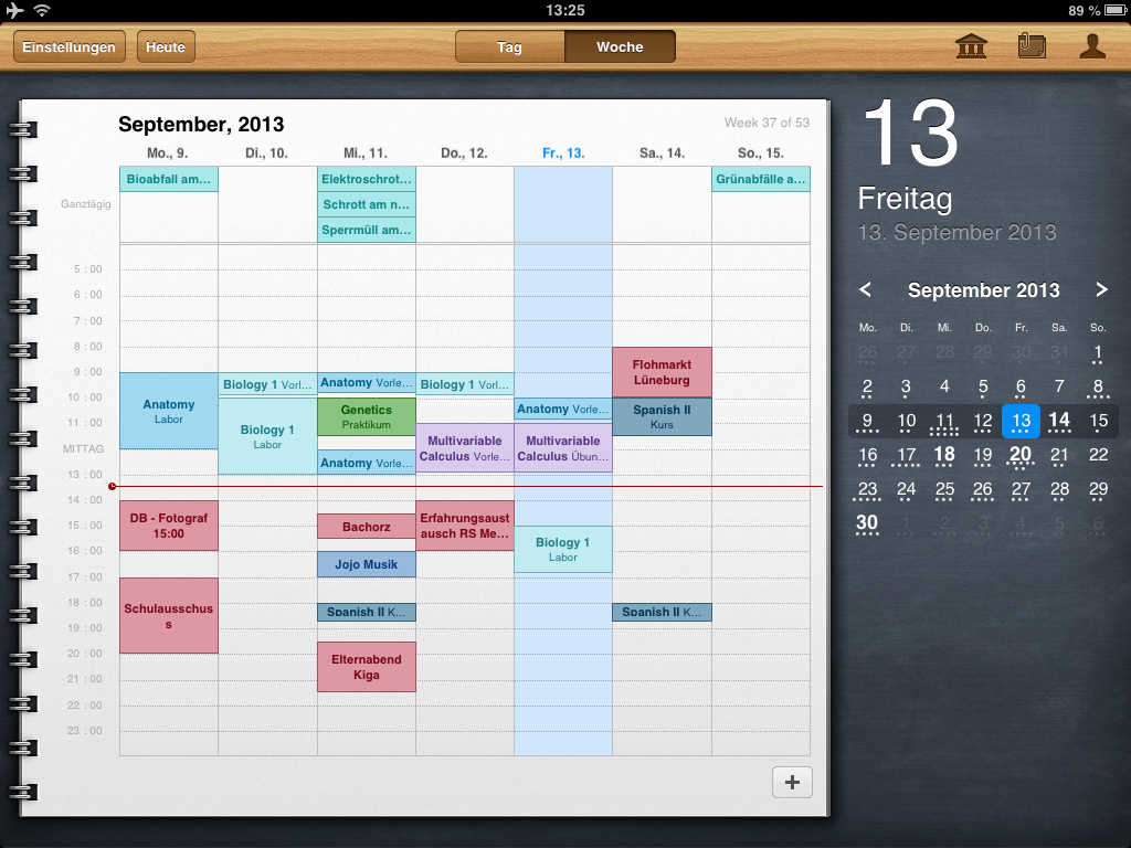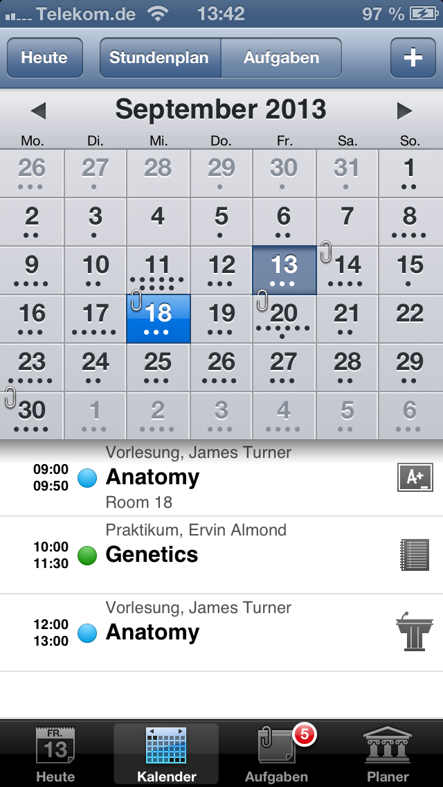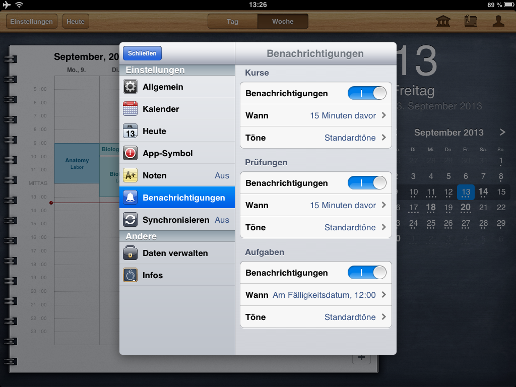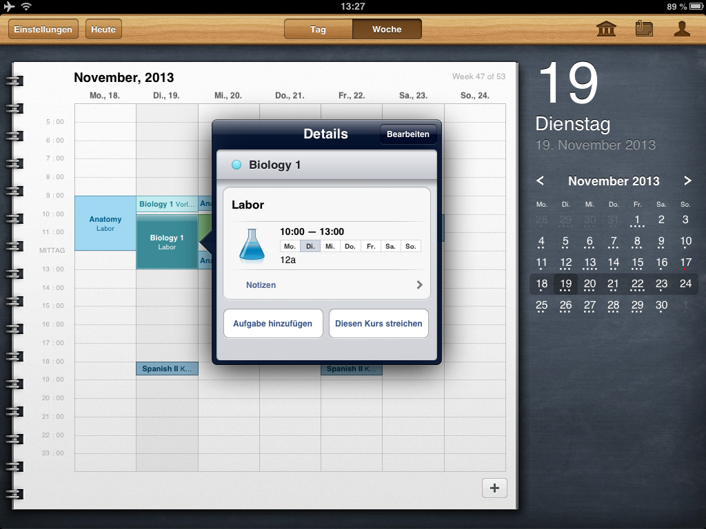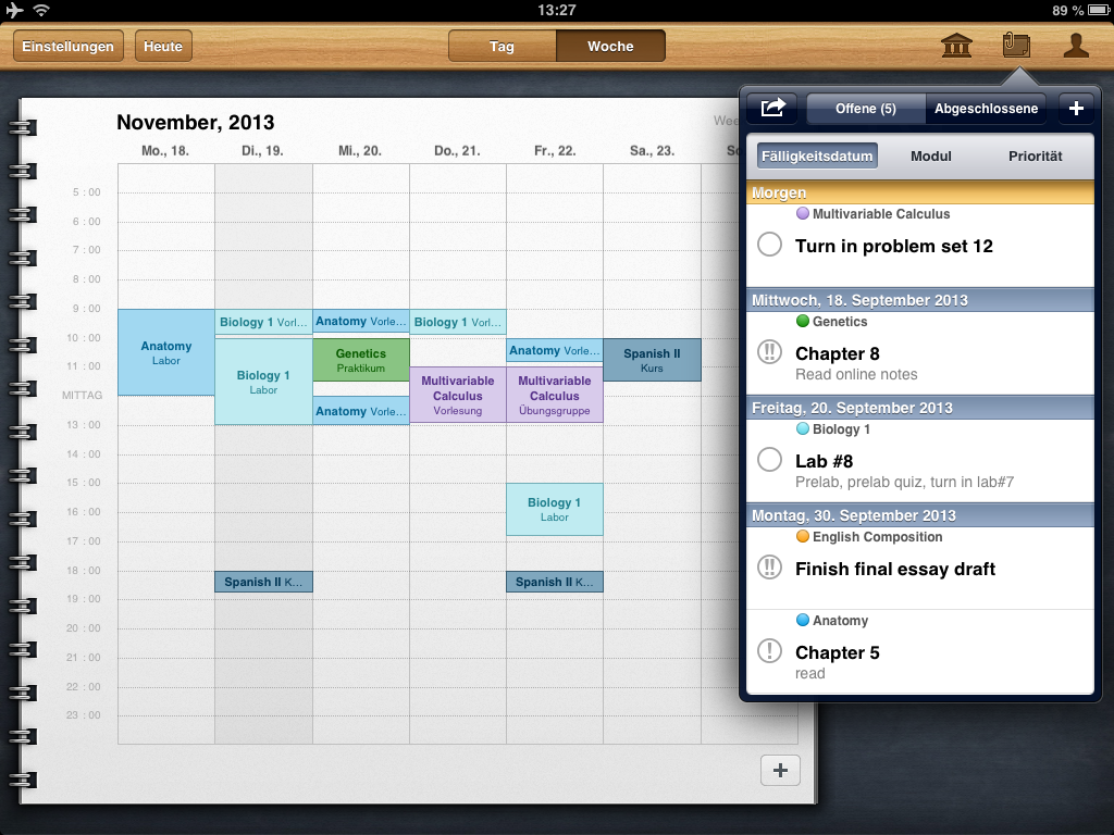 Auf den ersten Blick sieht iStudiez Pro aus, wie jeder andere Kalender. Die Darstellung auf iPad und iPhone unterscheidet sich stark, doch auf beiden Geräten wird das Optimum herausgeholt. Die Monatsansicht, die auf dem iPad immer zu sehen ist, weist bereits auf die anstehenden Termine hin. Unterstützt werden einmalige, wöchentliche, rotierende und Block-Veranstanlungen. Ein Tipp auf das entsprechende Datum öffnet die detaillierte Tagesansicht. Die zeigt die noch anstehenden Termine an, zurückliegende gibt es nur in der Wochenansicht zu sehen. Jedem Kurs fügt ihr, egal in welcher Ansicht, per Fingertipp eine Aufgabenliste inklusive Fälligkeitstermin hinzu. In einem eigenen Abschnitt nennt die App die Aufgaben und erinnert auch rechtzeitig vor deren Ablauf. Schafft ihr es nicht rechtzeitig, greift auf die eigene Kontaktliste zu und erfahrt hier die Sprechzeiten des Dozenten.
