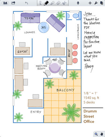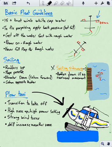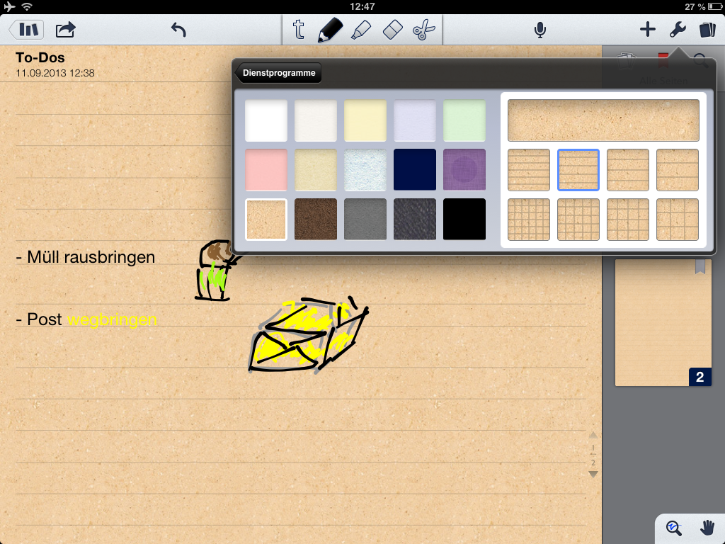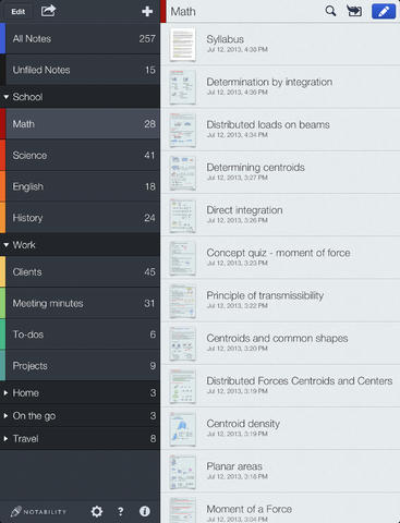 Egal ob ihr einen Einkaufszettel schreibt oder euch Notizen in der Vorlesung macht, Notability steht bereit. Nach dem Aufschlagen der virtuellen Seite könnt ihr gleich loslegen, jegliche Verwaltungsarbeit kann auch später geschehen. Notiert mit dem Finger, mit der Bildschirmtastatur oder drückt das Mikrofon für eine Audioaufnahme. Natürlich könnt ihr auch nach belieben wechseln. Mittendrin fügt ihr eine Skizze oder ein Foto ein. Für die bessere Übersicht nutzt ihr die Seitenvorschau, die Lesezeichen oder die Suche. Letzteres findet verständlicherweise nur getippte Worte. Da helfen dann Haftnotizen und Textmarker beim Auffinden. Für fast jedes Werkzeug könnt ihr Farbe und Form wählen. Wenn ihr die Ruhe habt, wählt das passende Papierimitat als Hintergrund und legt das Dokument in der Verwaltungsansicht in den von euch erstellten Ordner ab.