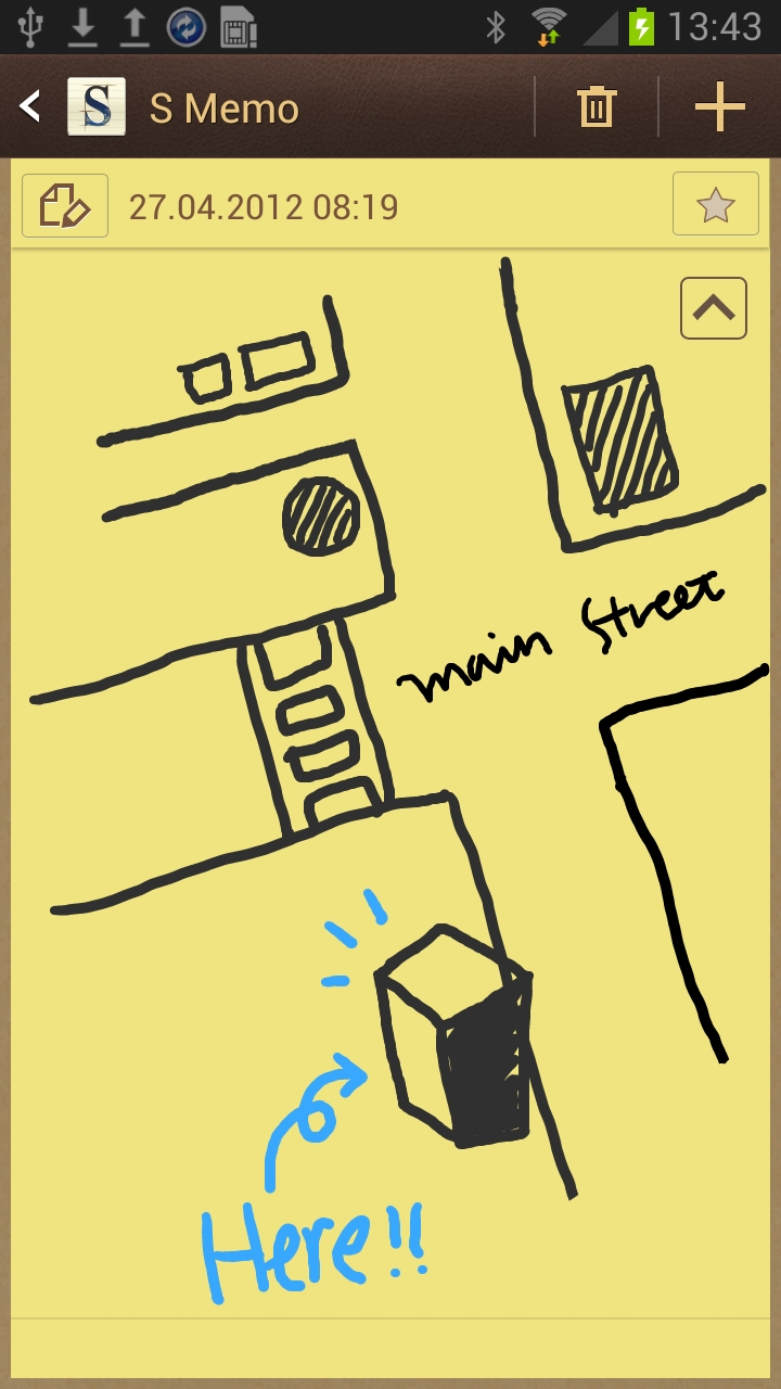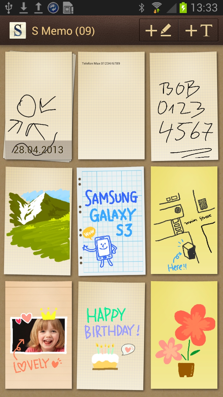Mit S Memo schenkt euch Samsung beispielsweise auf dem Galaxy S3 und dem Galaxy Express mit Android 4.1.2 einen endlosen Stapel virtueller Post-Its: Ihr könnt Text-, Sprach- und freihändig gezeichnete Notizen anlegen, diese wahlweise auf mehrere Seiten ausdehnen und mit Namen und/oder Datum versehen. Dazu genügt einfach ein Fingerzeig auf das große Plussymbol rechts oben, und schon wird euch ein leerer Notizzettel präsentiert. Dabei habt ihr die Wahl zwischen einem einfachen Text-Memo oder einer grafischen Notiz, die euch das freie Zeichnen mit dem Finger auf dem Display gestattet. Ein Tipp aufs Mikrofonsymbol lässt sogar die Aufnahme und Integration einer ins Mikro gesprochenen Notiz zu.